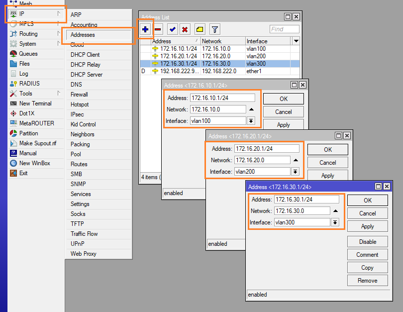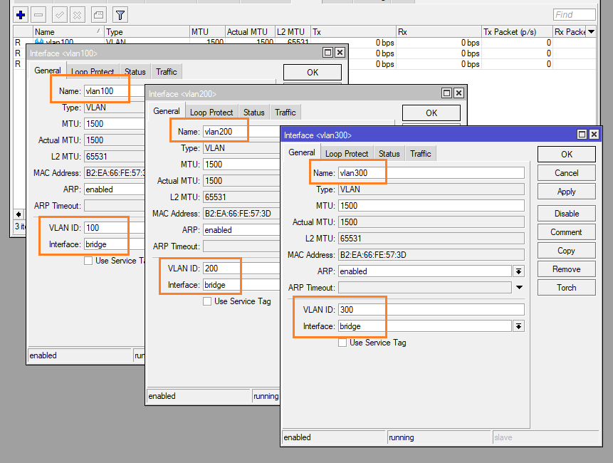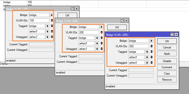 และสร้าง VLAN 200, 300 มาให้เหมือนกับ VLAN 100 โดยระบุ Interface เป็น bridge