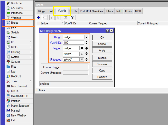 โดยสามารถตั้งค่าโดยการเข้าไปที่ Menu Bridge > Bridge > เลือก bridge ที่เราสร้างไว้ > ไปที่หัวข้อ VLAN
