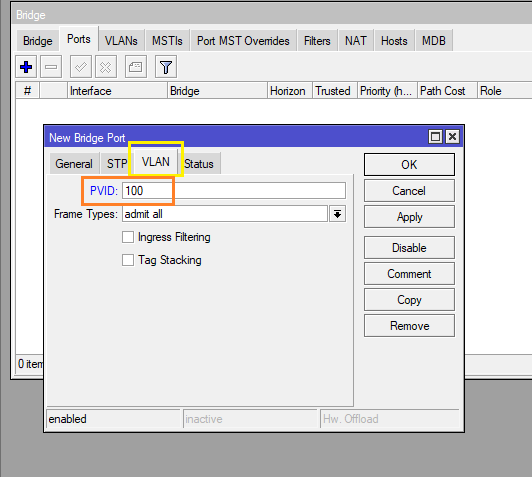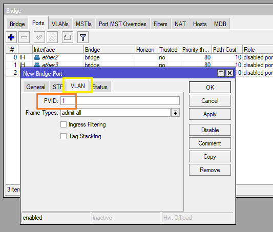 - VLAN Filtering: กด Enable (แนะนำให้ทำขั้นตอนสุดท้ายหลังจากกำหนดค่าหัวข้อ VLANs และ PVID บนหัวข้อ Ports มิเช่นนั้นหากเปิดทำงาน โดยไม่กำหนด PVID และการตั้งค่า Port จะไม่สามารถเข้าถึง Mikrotik ได้ หรือ หากอุปกรณ์มี Interface จำนวนมาก แนะนำให้กำหนดเฉพาะ Port ที่เราจะใช้เท่านั้น ส่วน Port ไหนว่างอยู่ก็ไม่จำเป็นต้องเอาเข้า Bridge)
