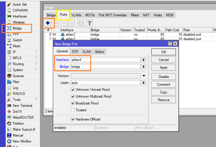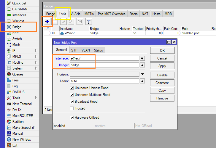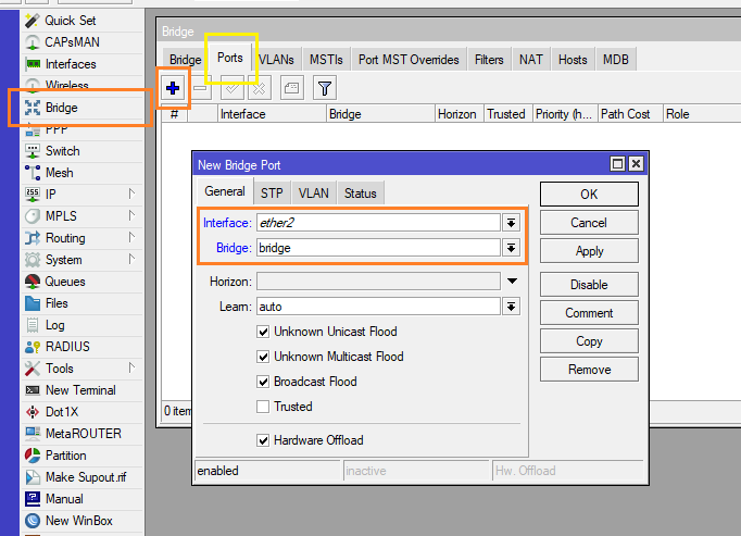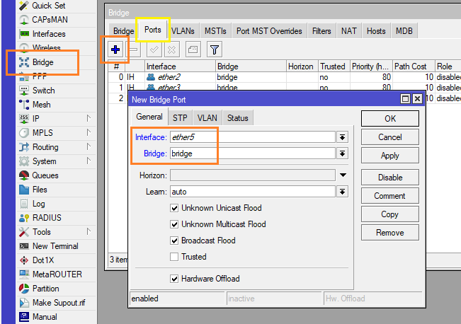 8.) เพิ่ม Interface เข้าไปใน Bridge ที่เราสร้างไว้ ไปที่ Menu Bridge > Ports > กด Add + ขึ้นมา