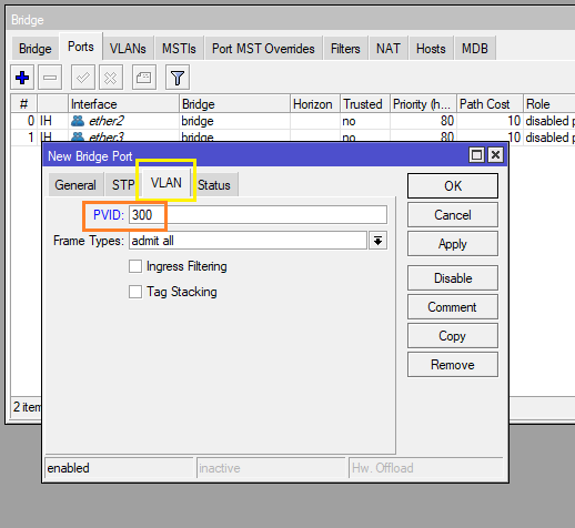 - vlan300 Untagged ที่ Interface ether4 ส่วน Tagged ที่ Interface bridge และ ether 5
