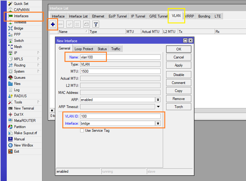 - Untagged: กำหนด Interface ที่ต้องการ ทำ Access Port ตามภาพจะกำหนดเป็น ether2 สำหรับ vlan100