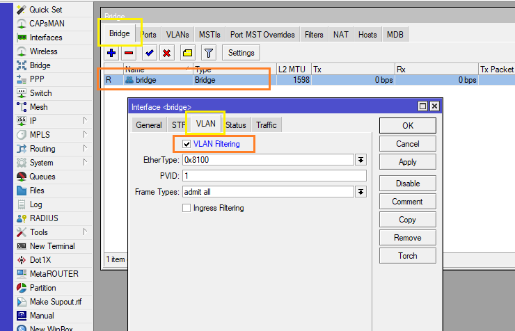 9.) และขั้นตอนสุดท้าย สำคัญญญญญญญญญญญญญญญญญญญญญญญ !!!! ที่สุด อย่าลืมเปิด Filtering VLAN บน Bridge มิเช่นนั้น VLAN ที่เรากำหนดมาจะไม่ทำงาน