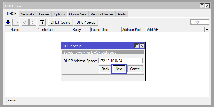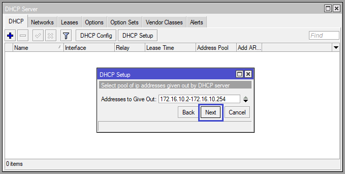 - Ether 2 Untagged VLAN 100 และแจก IP Address ให้กับผู้ใช้งาน โดยกำหนดเป็น DHCP Server Network 172.16.10.0/24