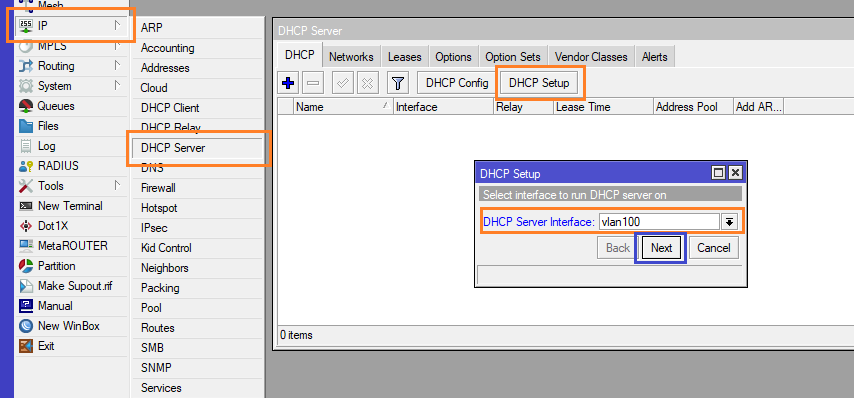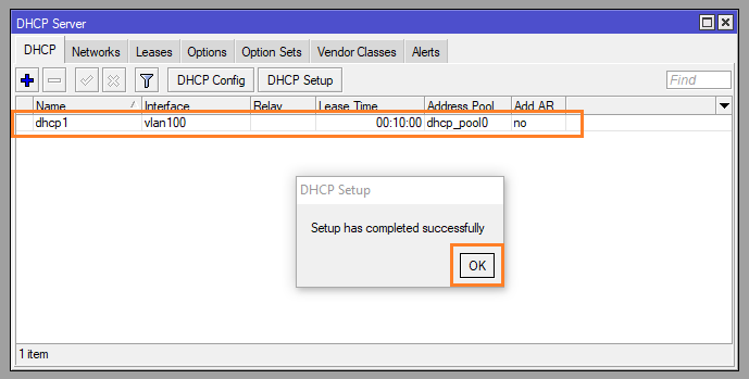 กด OK ภาพด้านล่างจะเห็นได้ว่า มีการสร้าง dhcp1 ที่ Interface vlan100 แล้ว