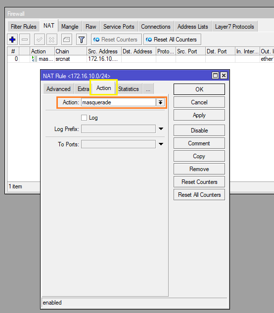 - Action: กำหนดเป็น Masquerade เพื่อสวมหน้ากาก LAN ของ Network วงที่เรากำหนดออกสู่ WAN ภายนอก