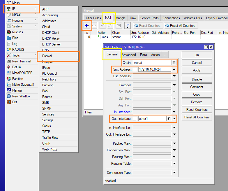6.) ตั้งค่า NAT ไปที่ Menu IP > Firewall > NAT > กด Add + เพิ่มขึ้นมา